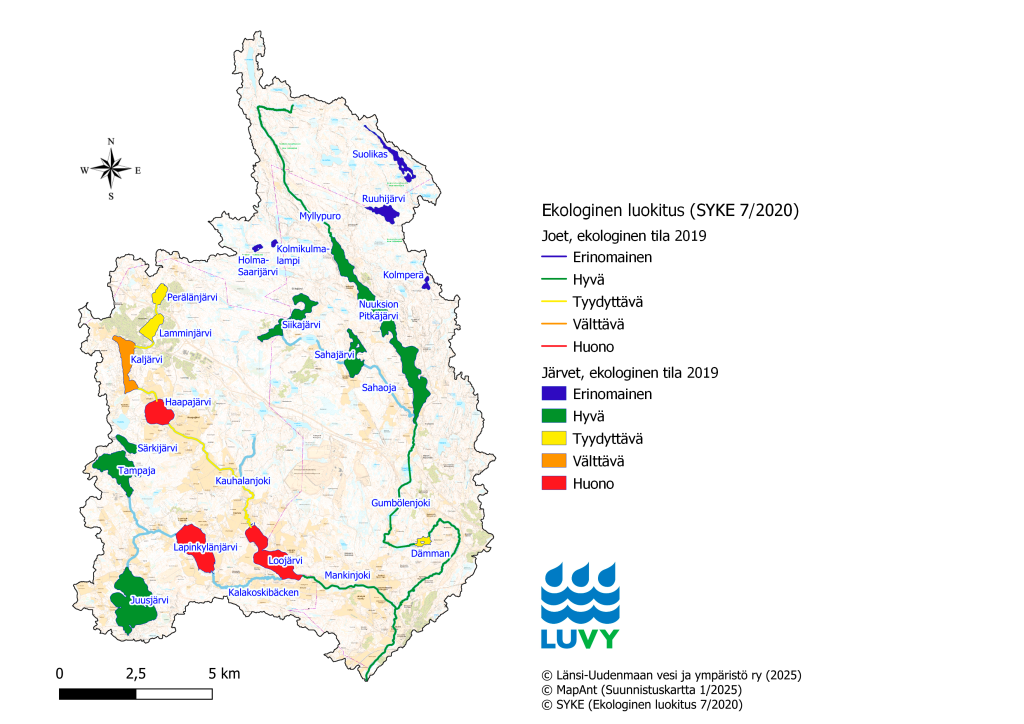 Mankinjoen valuma-alueen jokien ja järvien tila ekologisen luokituksen mukaisesti (LUVY).